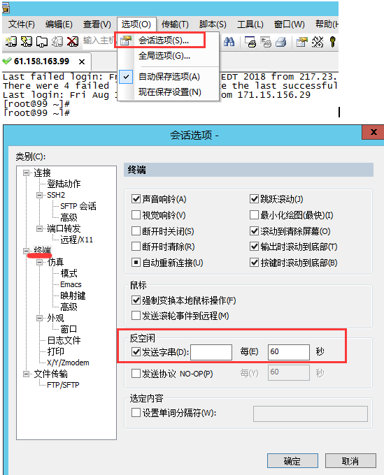 會(huì)話(huà)選項(xiàng) –> 終端 –> 反空閑–>選中發(fā)送協(xié)議 NO-OP(p) 每 60 秒。