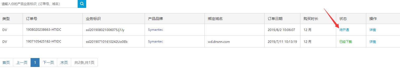 找到剛開通的SSL產(chǎn)品,點(diǎn)擊待開通